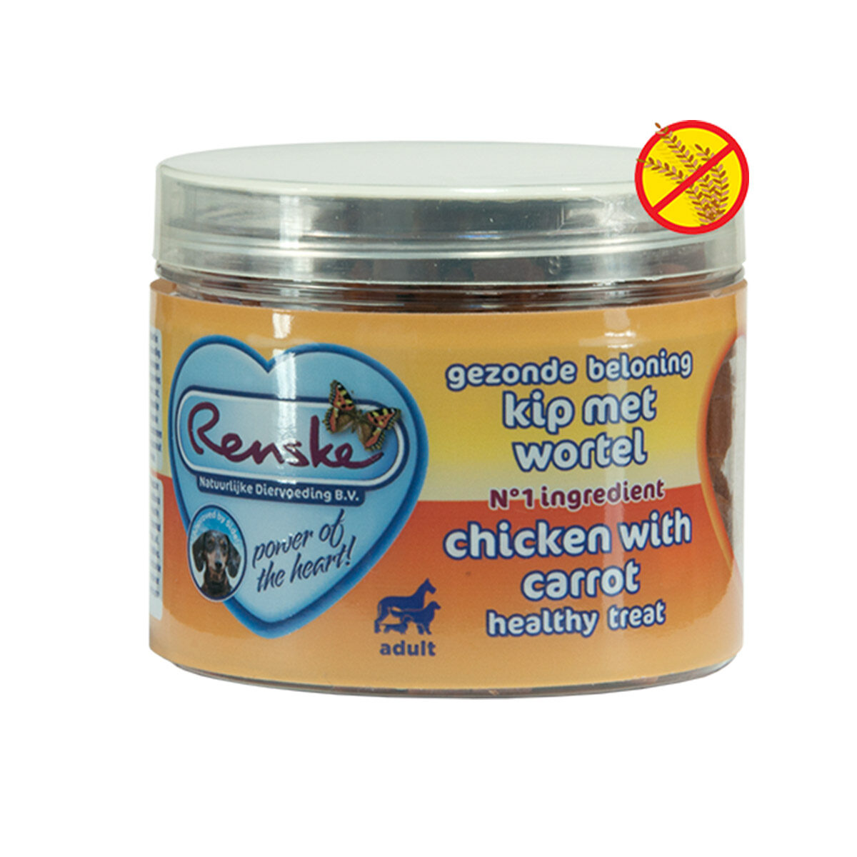 Renske Gezonde Beloning Hond Hartjes is verkrijgbaar in verschillende smaken: Eend, Kip & Broccoli, Kip & Oregano, Kip & Wortel en Zalm. Wordt geleverd in handige hersluitbare potjes van 100g.