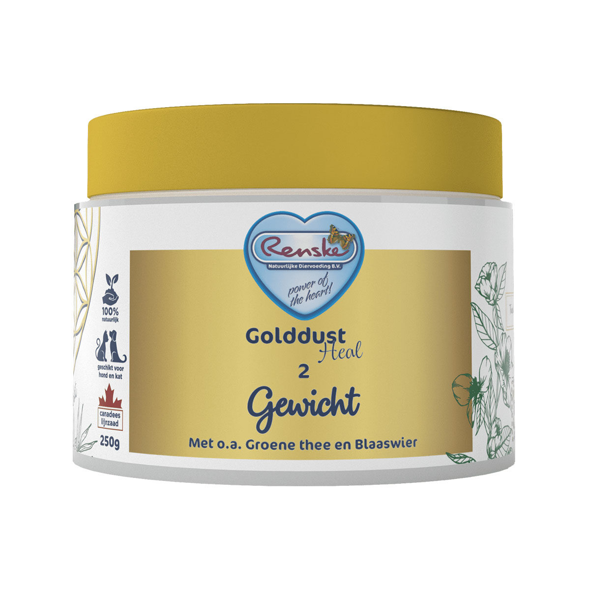Golddust Heal – Gewicht bevat een overvloed aan natuurlijke aanwezige vitaminen, mineralen, aminozuren, essentiële vetzuren en vezels. Het is de rijkste bron aan omega-3 vetzuren en plantaardige lignanen. Met een toevoeging van de werkzame kruiden guar gum, fenegriek, blaaswier en groene thee. Golddust Heal is een 100% natuurlijke lijn voedingssupplementen speciaal voor honden en katten. De supplementen zijn allen ‘energetisch volmaakt’, wat betekent dat de ingrediënten zijn afgestemd op het energetische veld van jouw dier, waardoor het product beter zijn werk kan doen.