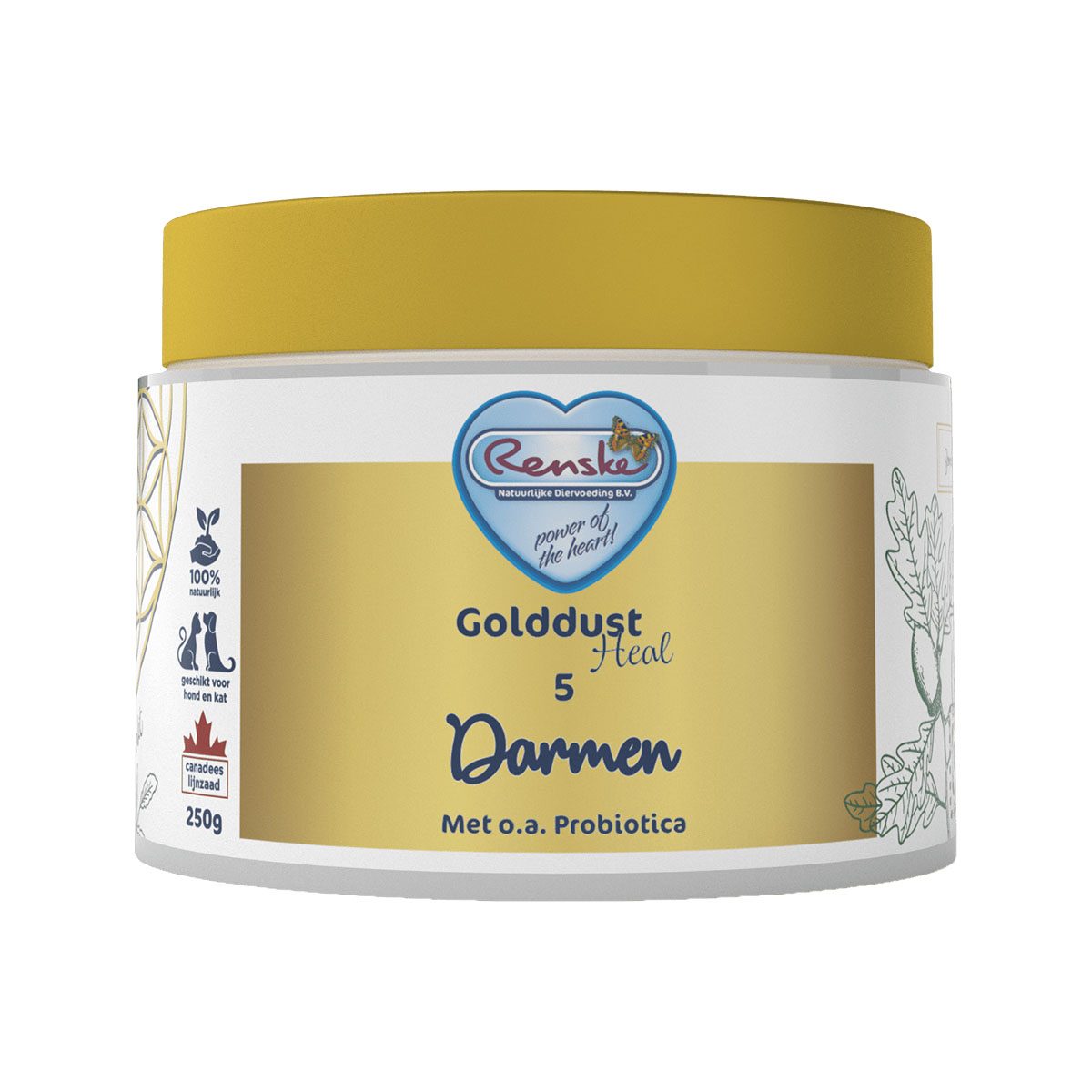 Golddust Heal – Darmen bevat een overvloed aan natuurlijke aanwezige vitaminen, mineralen, aminozuren, essentiële vetzuren en vezels. Het is de rijkste bron aan omega-3 vetzuren en plantaardige lignanen. Met een toevoeging van de werkzame kruiden tormentil, zomereik en indiase wierook. Daarnaast bevat deze variant pre- en probiotica in de vorm van fructo-oligosacchariden (FOS) en lactospore. Golddust Heal is een 100% natuurlijke lijn voedingssupplementen speciaal voor honden en katten. De supplementen zijn allen ‘energetisch volmaakt’, wat betekent dat de ingrediënten zijn afgestemd op het energetische veld van jouw dier, waardoor het product beter zijn werk kan doen.