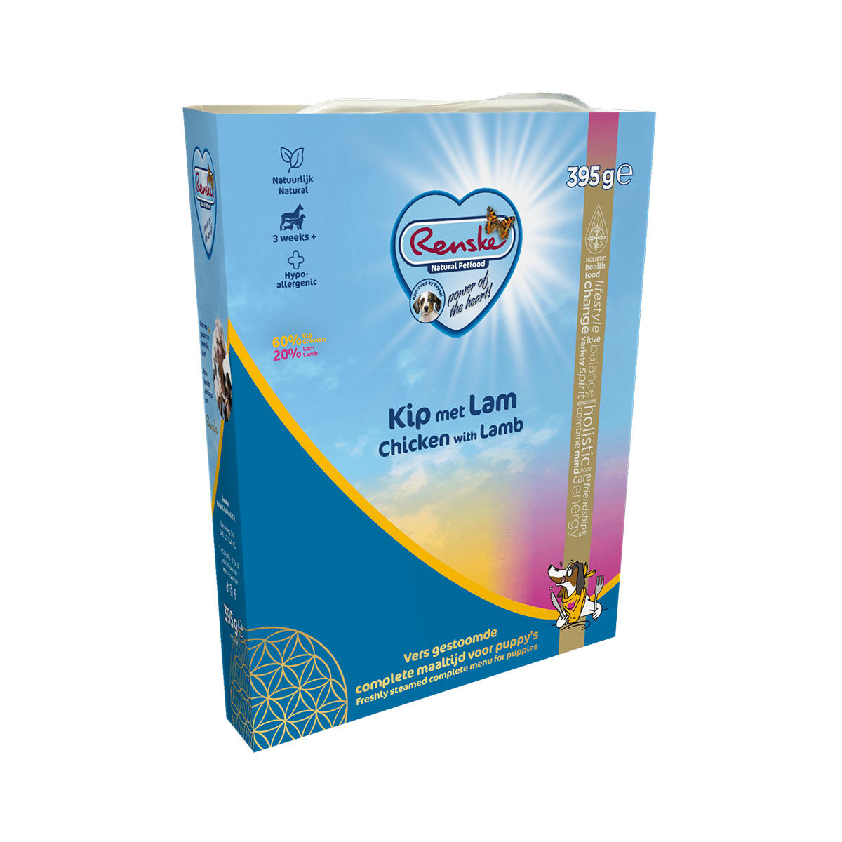 Renske Hond Puppy&Junior Verse Kip&Lam 395gr is een gestoomde Vers Vlees Maaltijd voor pups vanaf 2,5 weken.