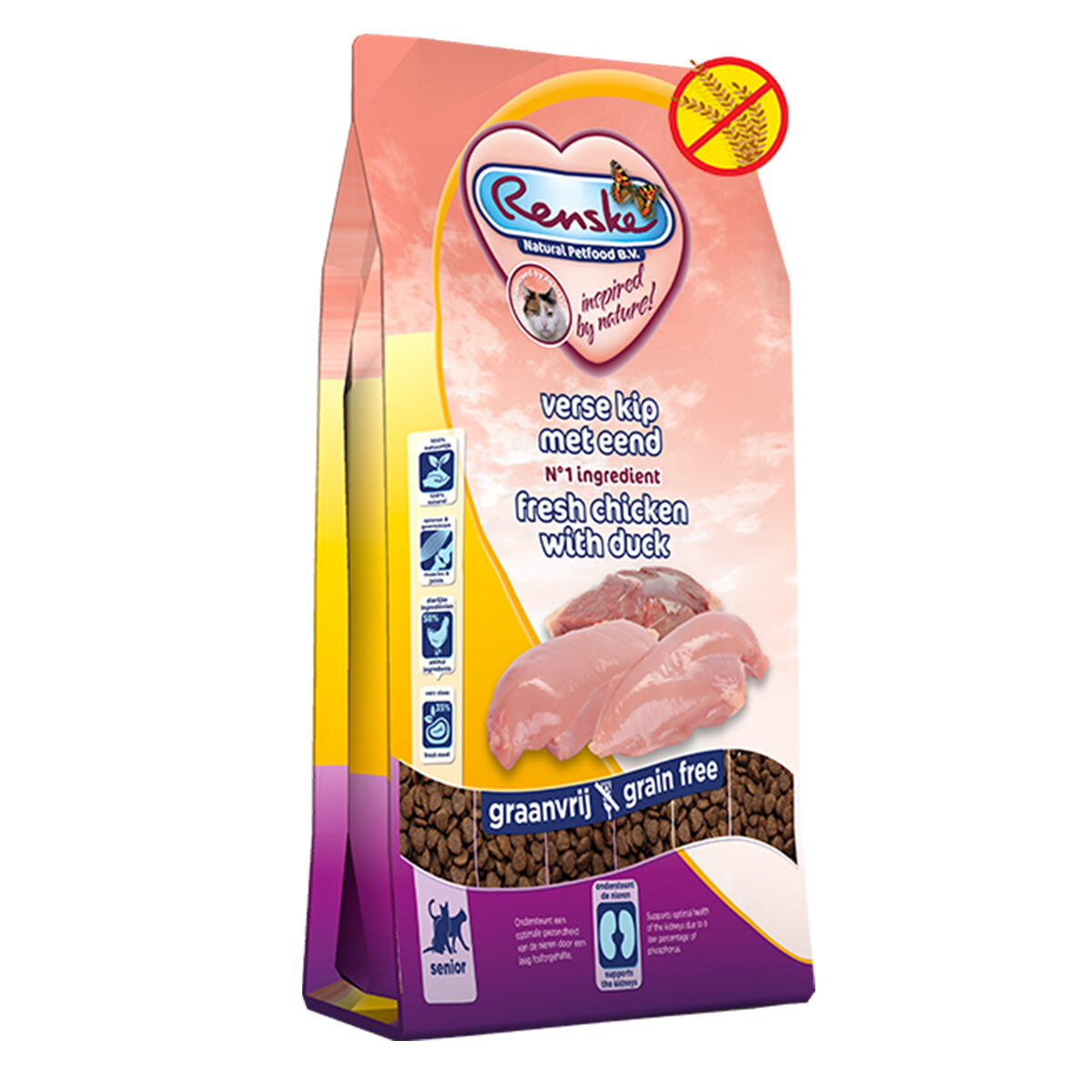 Renske Super Premium Droog Kat Senior Kip&Eend 6 kg. Renske Super Premium Droog Kat Senior Kip&Eend is een complete, licht verteerbare voeding met verse kip en eend. Geschikt voor oudere katten van alle rassen. Is jouw kat een senior? Deze brokjes ondersteunen het lichaam voor een fijne 'oude dag'.