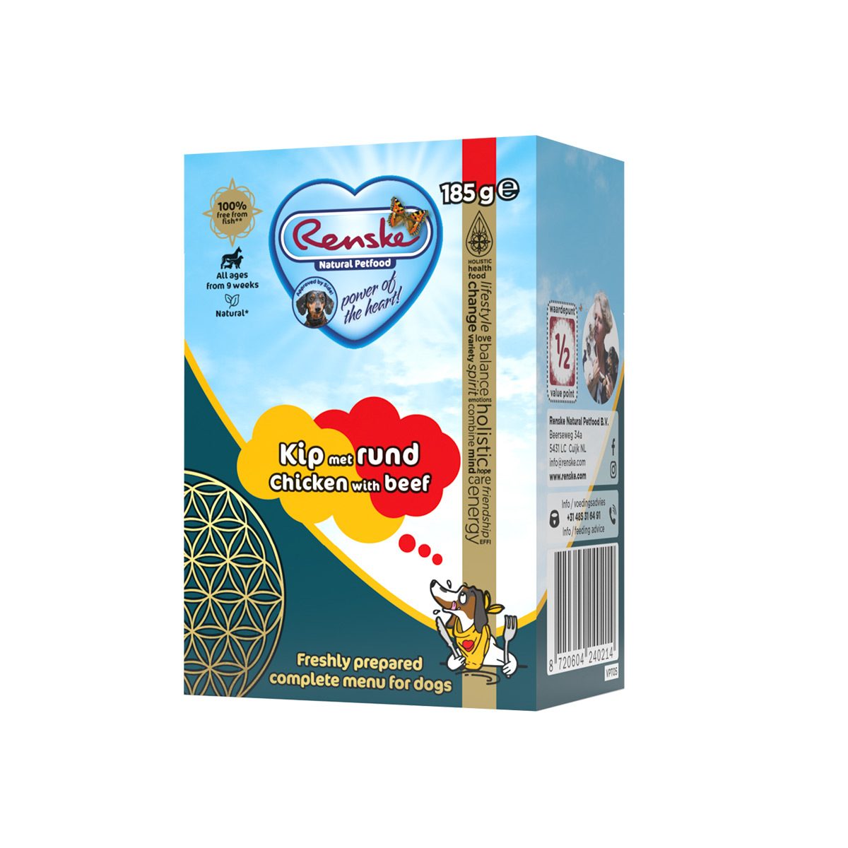 De vers bereide kipmaaltijd met rund van Renske is een complete hondenvoeding geschikt voor alle honden vanaf 9 weken. De voeding bevat 60% vers bereide kip met rund. De vers bereide vleesvoeding is verrijkt met duindoorn, gedroogde algen en yucca schidigera en aangevuld met rijst en groenten waardoor je hond nog meer zal smullen! De maaltijd is licht verteerbaar en erg geschikt voor honden die met moeite willen eten.
