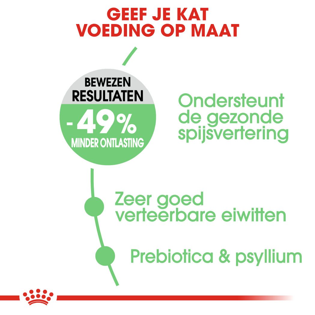 ROYAL CANIN® Digestive Care is ook beschikbaar als natte voeding in een overheerlijke saus of als een zachte smakelijke paté. Volg onze voedingsrichtlijnen als je van plan bent om je kat gemengd te voeren, zodat zij de optimale hoeveelheden droog- en natvoeding voorgeschoteld krijgt.