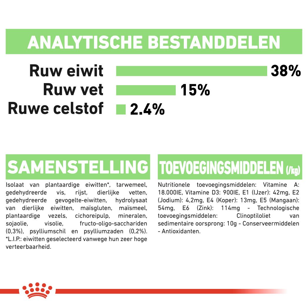 Isolaat van plantaardige eiwitten*, tarwemeel, rijst, gedehydreerde vis, dierlijke vetten, gedehydreerde gevogelte-eiwitten, hydrolysaat van dierlijke eiwitten, maïsgluten, maïsmeel, plantaardige vezels, cichoreipulp, mineralen, sojaolie, visolie, Fructo-Oligo-Sacchariden (0.3%), psylliumschil en psylliumzaden (0.2%)