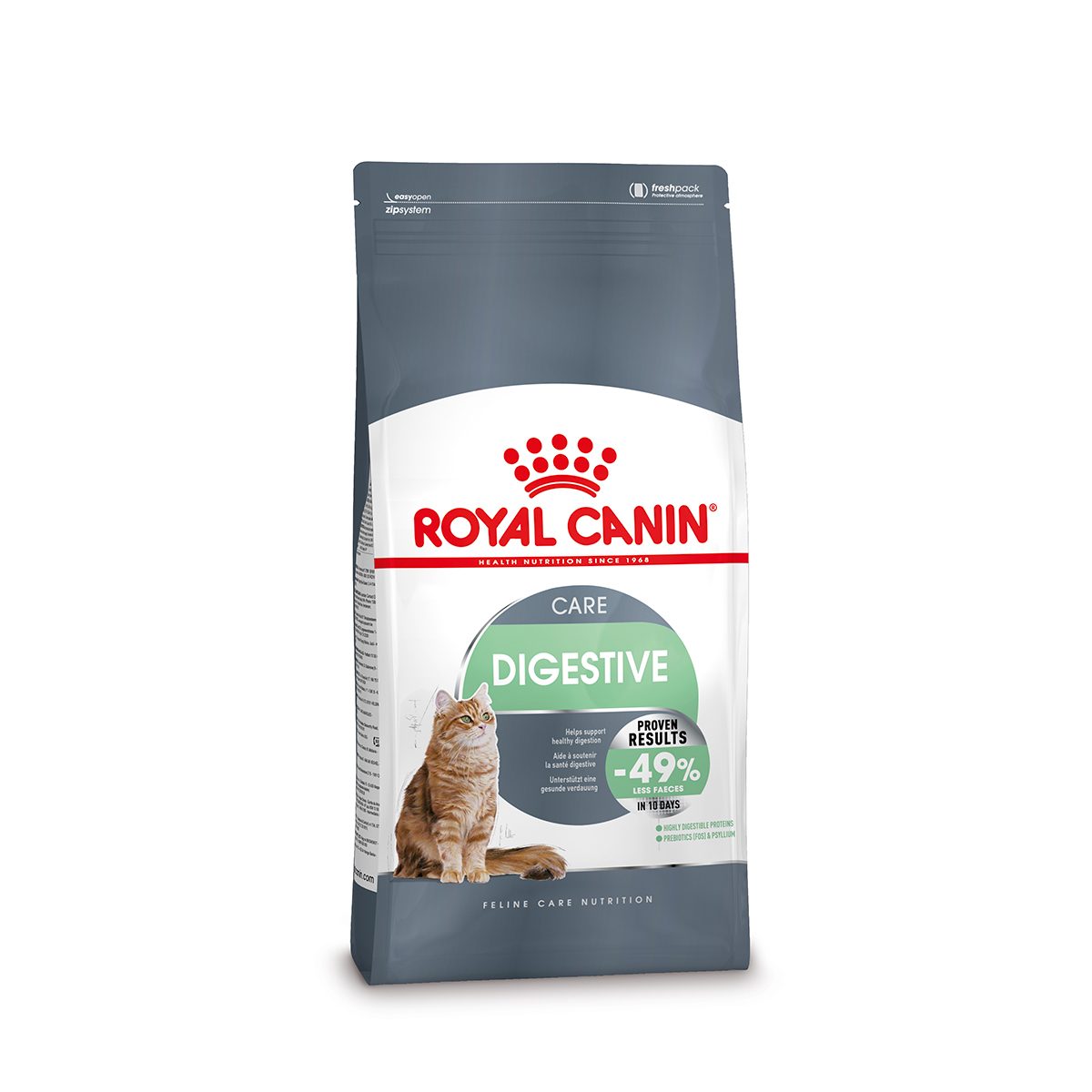 ROYAL CANIN® Digestive Care is bewezen effectief: na 10 dagen exclusief gebruik van Digestive Care gedurende 10 dagen, verminderde de productie van ontlasting met 49%, dankzij de optimale voedingsstoffen en verteerbaarheid.