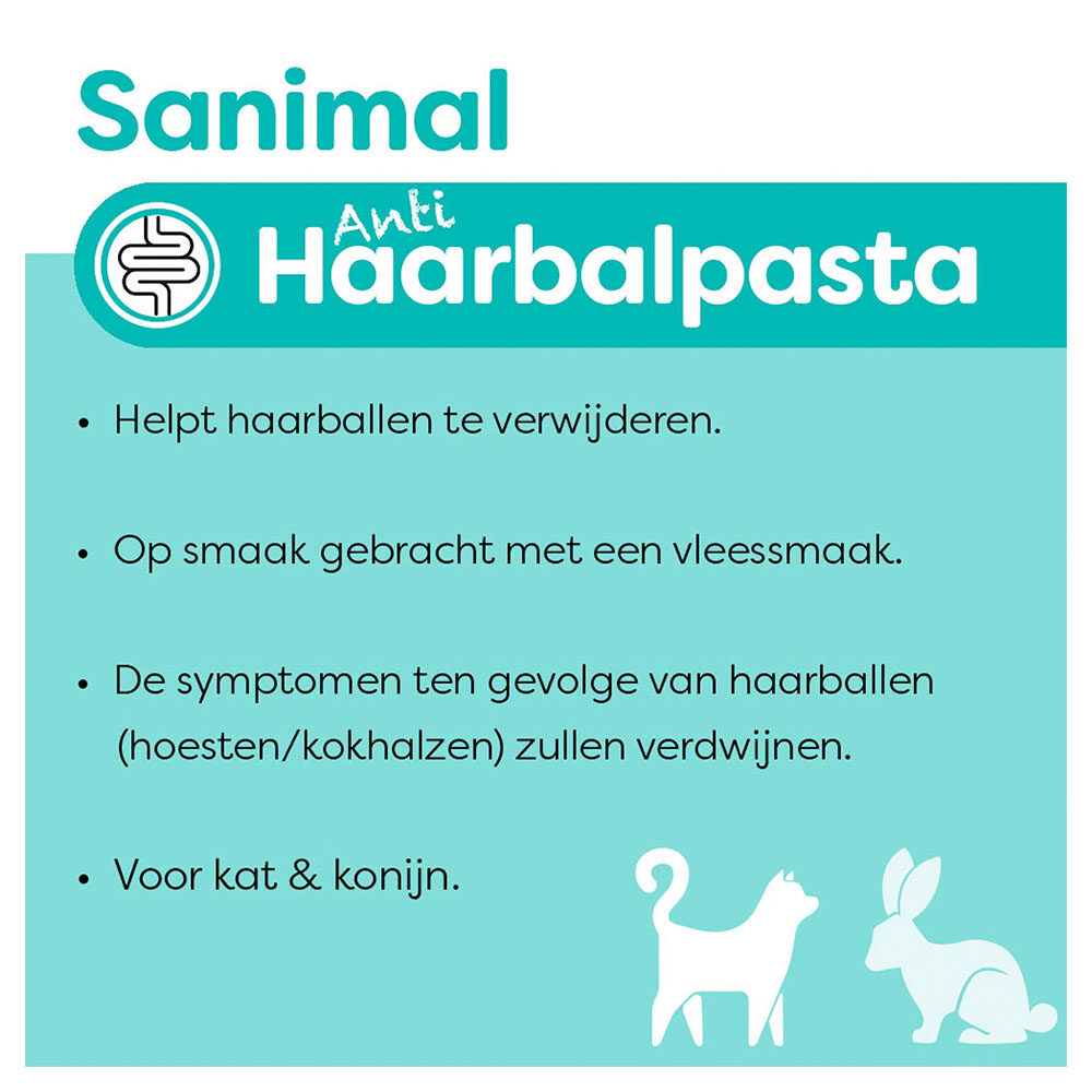 De Anti-haarbalpasta van Sanimal is dé oplossing om haarballen te verwijderen bij katten en konijnen vanaf 6 maanden. De pasta verlicht symptomen zoals hoesten en kokhalzen na het verwijderen van haarballen. Dankzij de heerlijke vleessmaak wordt het niet alleen effectief, maar ook nog eens lekker voor je huisdier.