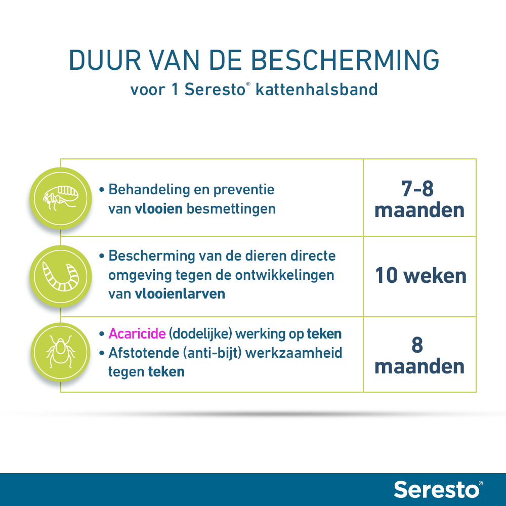 LET OP: Er zijn NEP-SERESTO banden in omloop. Download de factsheet en ontdek hoe je een echte Seresto-halsband kunt herkennen: Download factsheet Seresto banden
