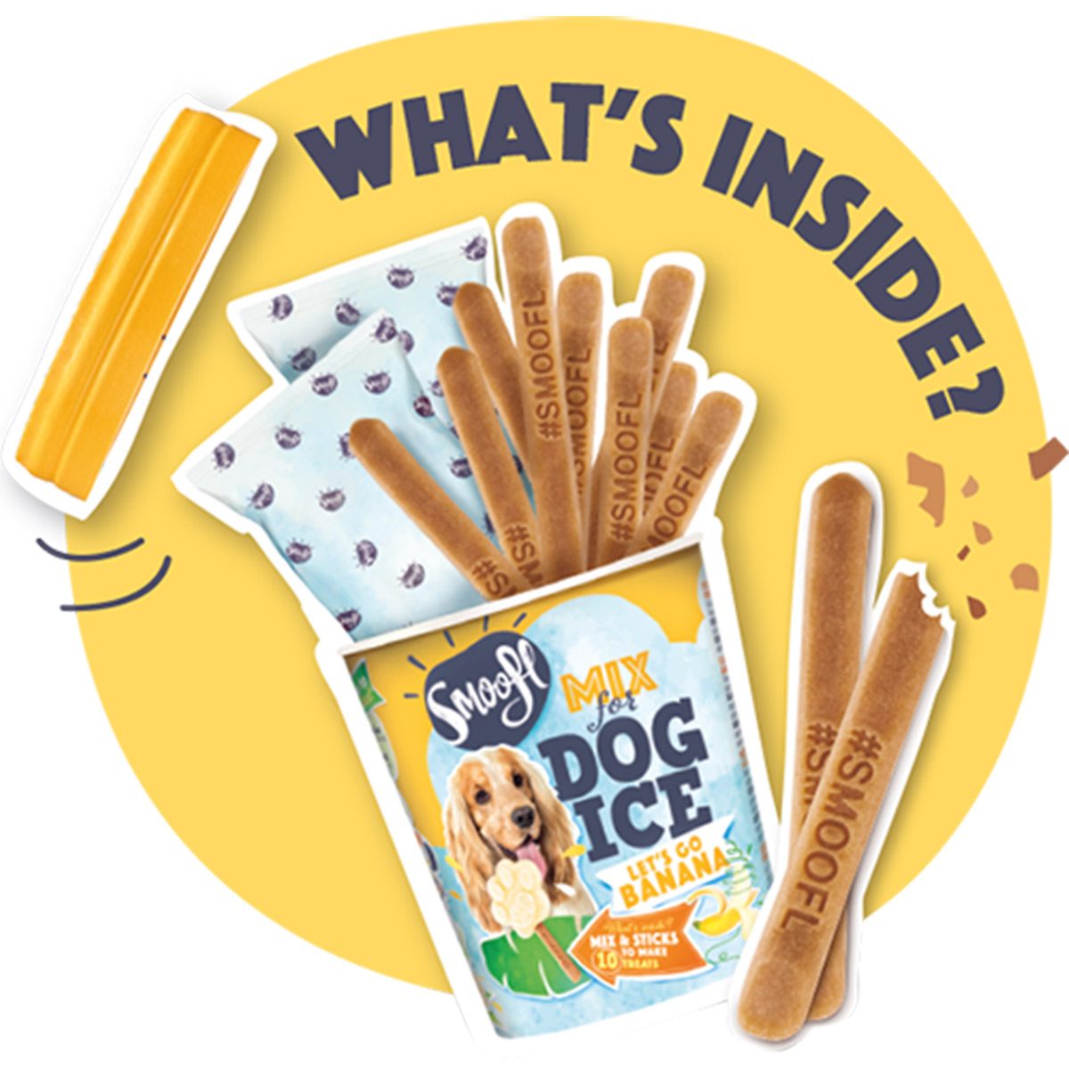 Inhoud potje: Smoofl bananenmix en 10 eetbare stokjes. IJsjesvorm niet inbegrepen. De ijsmix is goed voor +-10 ijsjes voor een kleine hond en +-6 voor een grote hond. Verkrijgbaar in verschillende smaken.