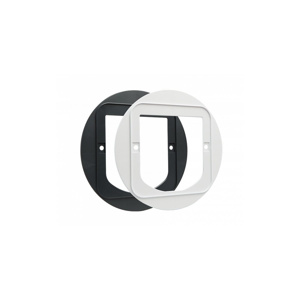 De montageadapter kan gebruikt worden wanneer u het Microchip SureFlap Kattenluik, het Microchip DualScan Kattenluik of het Microchip SureFlap kattenluik Connect in glas wil plaatsen. Met behulp van de adapter kunt u het luik monteren in gaten met een doorsnede van (min) 212 mm tot (max) 260 mm. De totale doorsnede van de montageadapter is 285 mm. De montageadapter kan ook gebruikt worden wanneer u het Microchip DualScan Kattenluik in een muur wilt monteren. Voor de Microchip SureFlap Kattenluik of het Microchip SureFlap kattenluik Connect is dat niet nodig omdat deze al gaten in het voorframe hebben waarmee ze aan de muur bevestigd kunnen worden. De montageadapter bestaat uit twee delen: één voor de binnenkant en één voor de buitenkant van het huis."