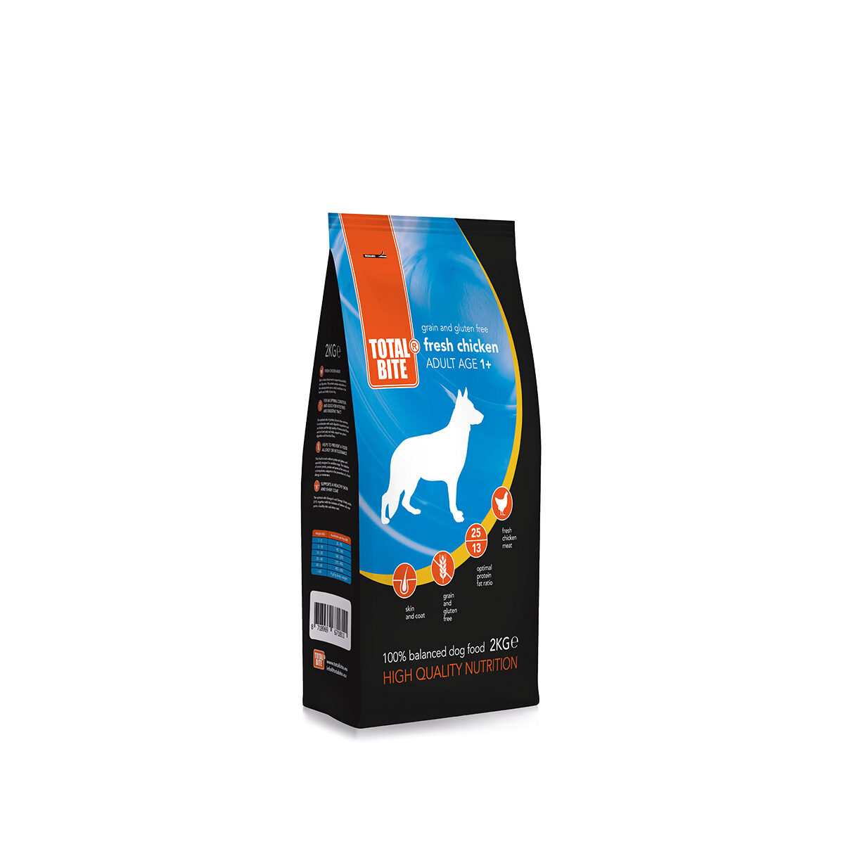 Total Bite Adult Fresh Chicken is verkrijgbaar in zakken van 2 kg of 10 kg. Ook is er van deze smaak een variant voor puppy's: Total Bite Dog Puppy Fresh Chicken.