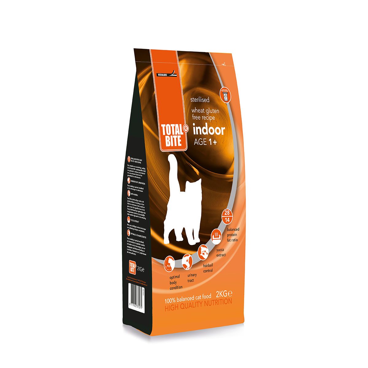 Total Bite Cat Indoor-Sterilised 2 kg. Een gesteriliseerde en binnenkat kan sneller last hebben van zijn urinewegen en overgewicht. Total Bite Indoor/Sterilised houdt de urinewegen van jouw kat gezond en zorgt ervoor dat jouw kat op het juiste gewicht blijft. Omdat een binnenkat minder actief is dan een buitenkat, heeft een binnenkat ook minder energie nodig. Een goede brok met minder vet is daarom erg belangrijk.