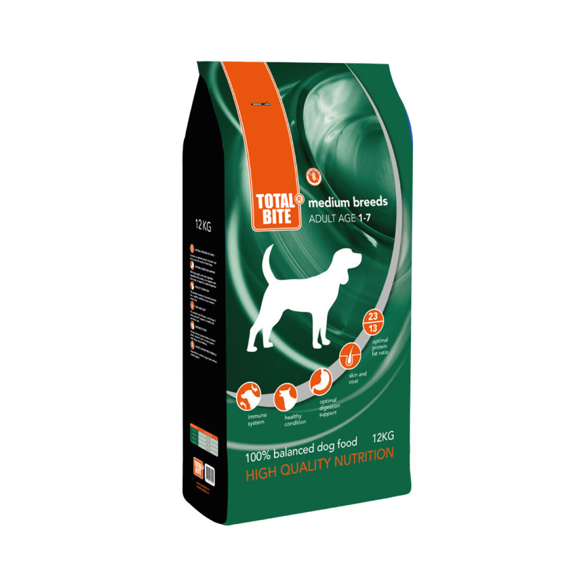 Total Bite Dog Adult Medium Breeds is verkrijgbaar in zakken van 3 kg en 12 kg. Voor puppy's is er ook een variant: Total Bite Puppy Medium Breeds.