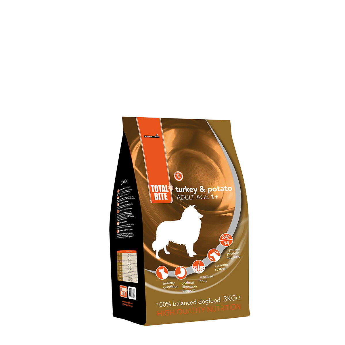 Total Bite Dog Turkey & Potato Glutenvrij is verkrijgbaar in zakken van 3 kg of 12 kg.