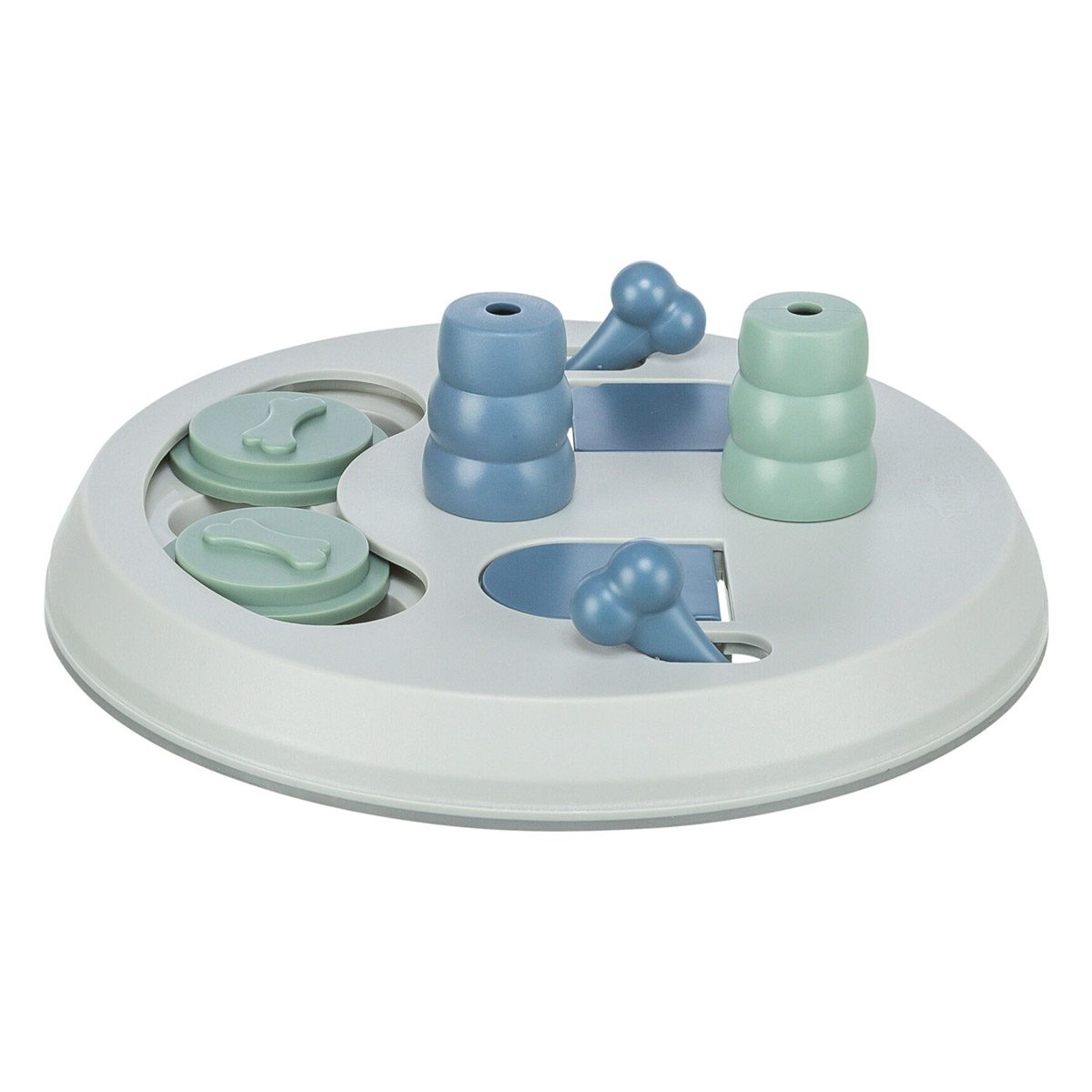 Trixie Dog Activity Flip Board 23 cm. Verstop snacks of brokjes achter de schuifjes, onder de pinnen of klepjes. Jouw hond zal de snacks ruiken en verschillende technieken moeten gebruiken om bij het lekkers te komen. Onder de pootjes van het spel zit anti-slip waardoor hij niet over de vloer schuift tijdens het zoeken naar lekkers.