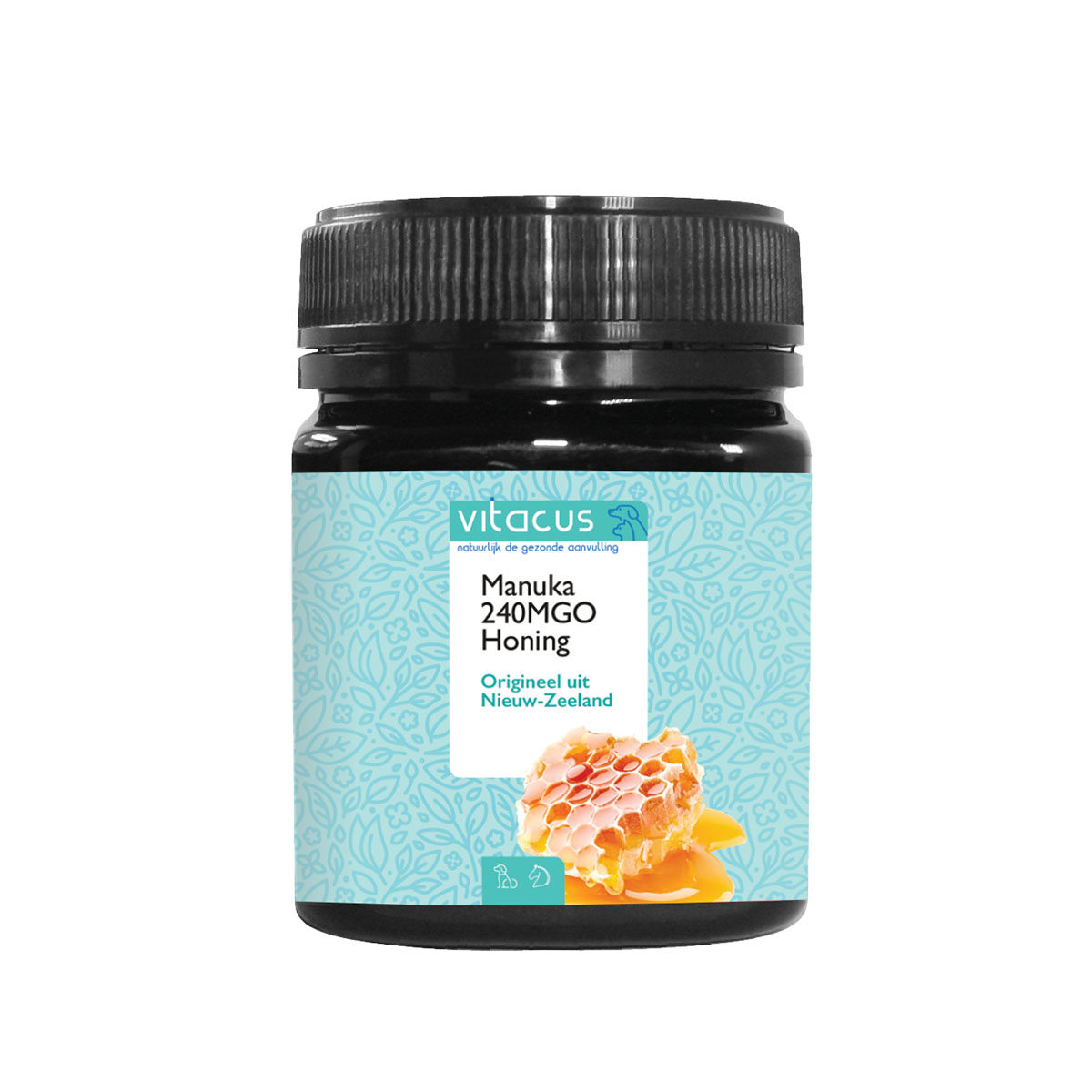De Vitacus Manukahoning bevat een originele kwaliteit monoflorale honing uit Nieuw-Zeeland. Deze honing bevat minstens 240 mg MGO (methylglyoxal) per kilogram honing. MGO is de waarde van de Manukahoning welke wordt afgeleid van de hoeveelheid dihydroxyacetone (DHA) die op natuurlijke wijze voorkomt in de nectar van de Manukastruik (deze groeit uitsluitend in Nieuw-Zeeland). De Manukahoning is MGO-gecertificeerd en getest door onafhankelijke laboratoria. Bij deze honing kan natuurlijke kristallisatie voorkomen. Indien je de honing wat warm maakt, zal deze weer vloeibaarder worden. Let op dat de honing niet te warm wordt, hierdoor kunnen waardevolle enzymen verloren gaan.