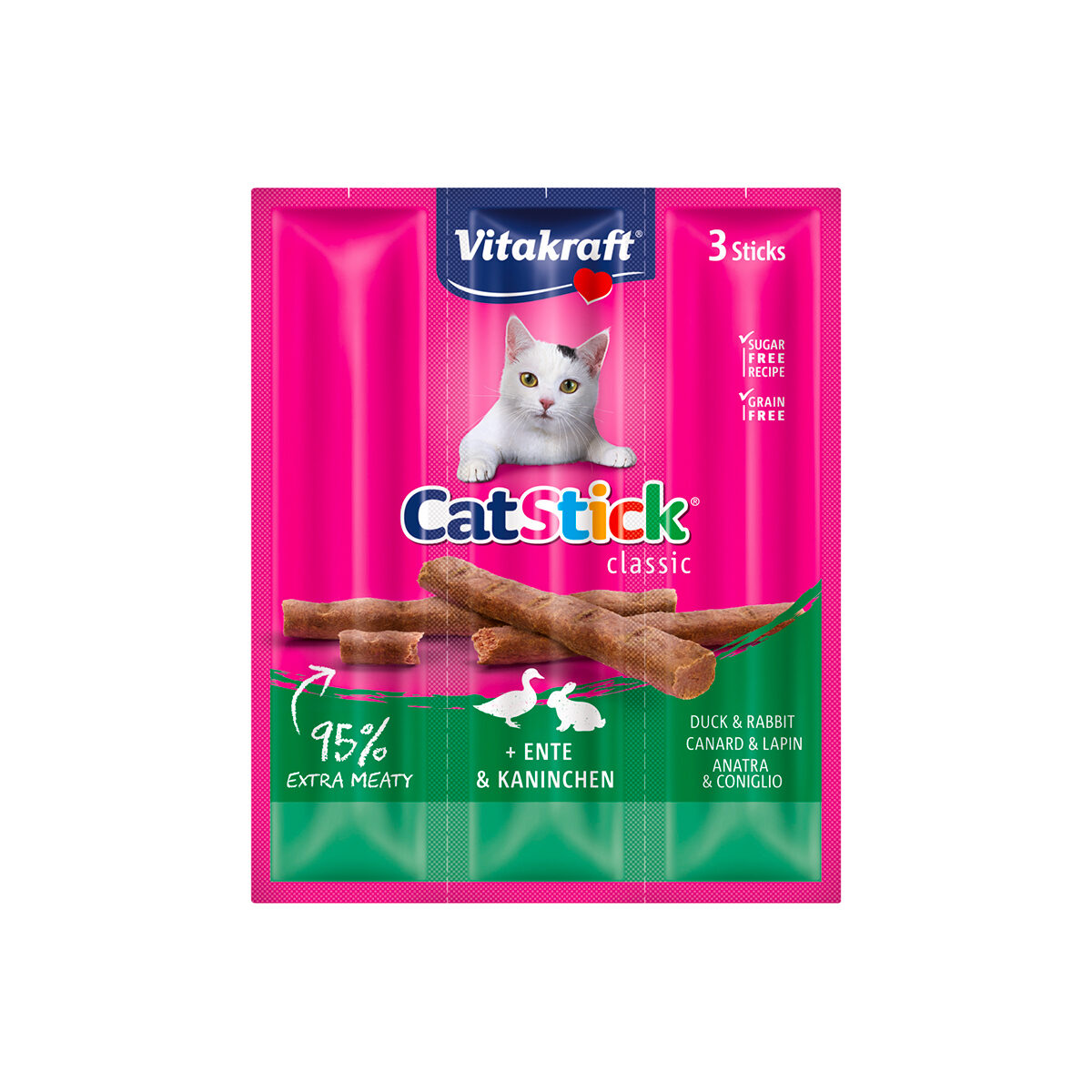 Vitakraft Cat Stick Mini Eend&Konijn. De Cat Stick mini met eend en konijn is een gezonde en zachte snack voor jouw kat. Het vleesgehalte is zeer hoog (95%) en de receptuur is suikervrij. De smaak is onweerstaanbaar en deze snack bevat geen kleurstoffen en smaakversterkers. De Cat Stick mini heeft handige afbreekpunten waardoor de stick in kleine stukjes kan worden gevoerd. Ze zijn per drie stuks, afzonderlijk in folie verpakt om de versheid van de Cat Stick mini te kunnen garanderen. Verkrijgbaar in diverse smaken.