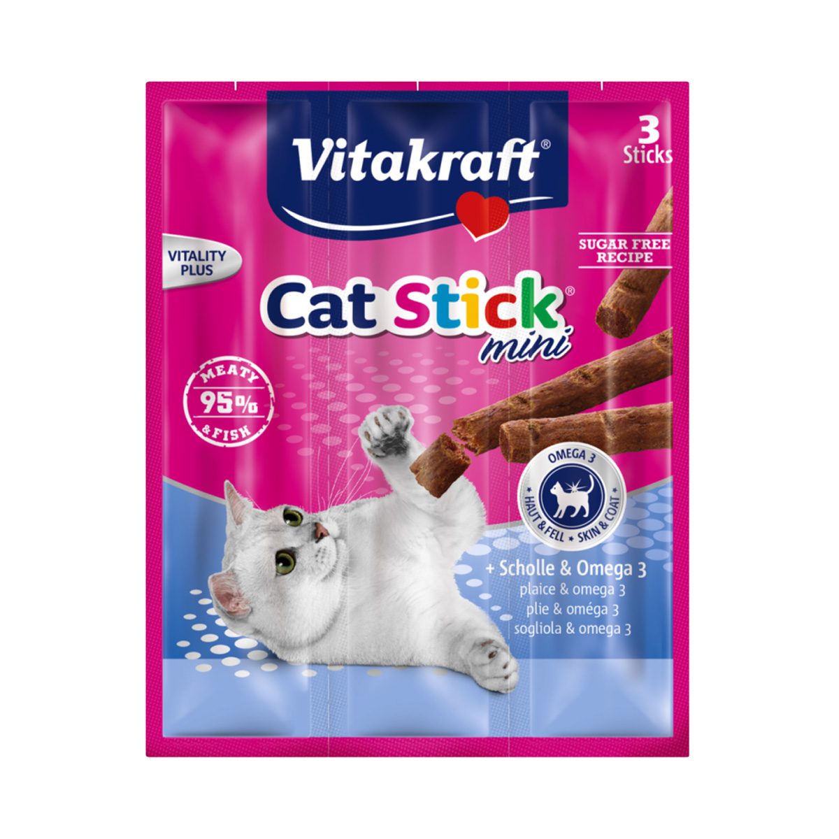 Vitakraft Cat Stick Mini Schol&Omega 3. De Cat Stick mini met schol en Omega 3 is een gezonde en zachte snack voor jouw kat. De Omega 3 vetzuren zorgen voor een gezonde huid en vacht. Het visgehalte is zeer hoog (95%) en de receptuur is suikervrij. De smaak is onweerstaanbaar en deze snack bevat geen kleurstoffen en smaakversterkers. De Cat Stick mini heeft handige afbreekpunten waardoor de stick in kleine stukjes kan worden gevoerd. Ze zijn per drie stuks, afzonderlijk in folie verpakt om de versheid van de Cat Stick mini te kunnen garanderen. Verkrijgbaar in diverse smaken.