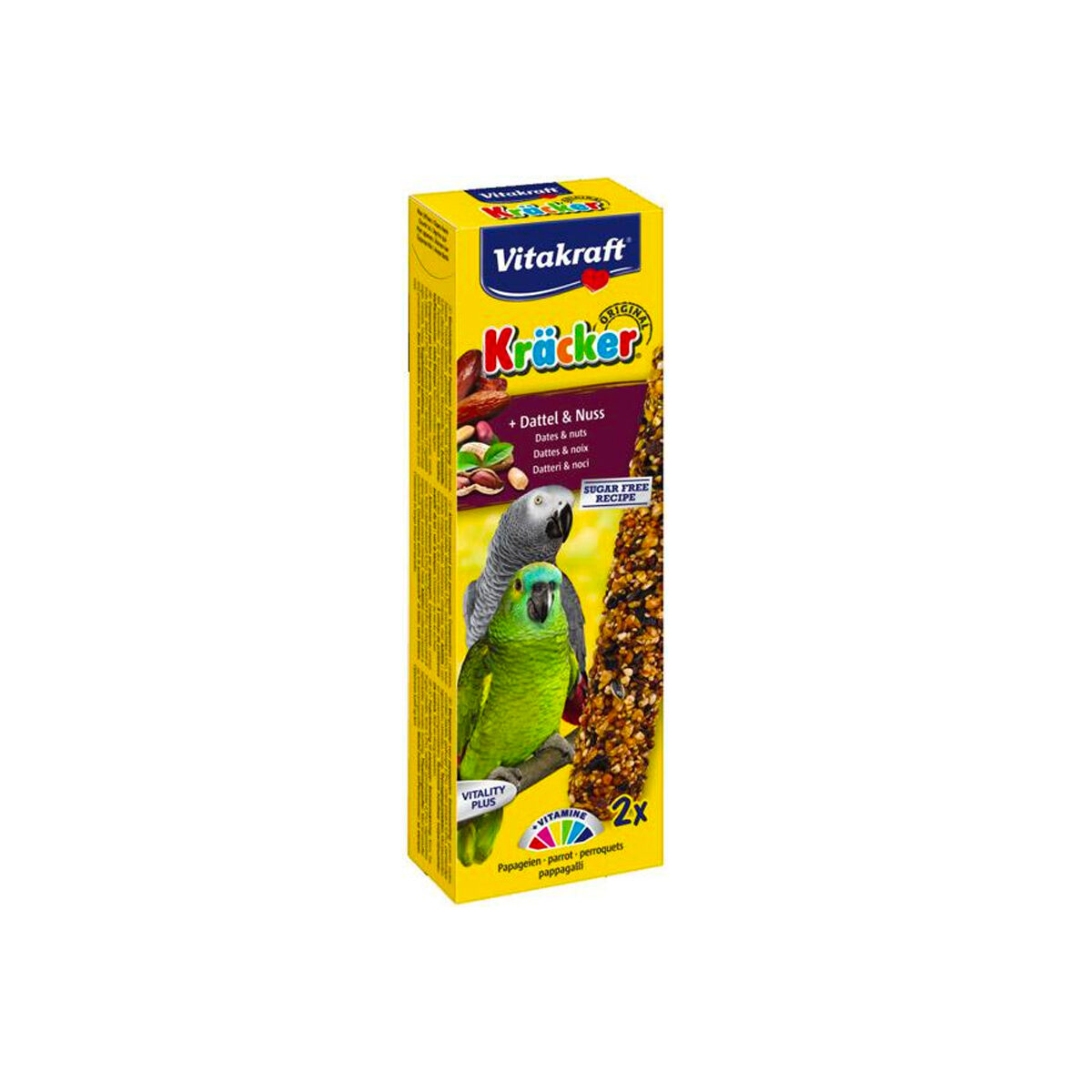 Vitakraft Kräcker Papegaai 2In1 Dadel-Noot. Vitakraft Kräckers zijn gezonde, lekkere en knapperige kräckers speciaal ontwikkeld voor allerlei verschillende soorten vogels. Deze kräckers zijn 2x gebakken waardoor het een extra natuurlijk effect geeft. De vogel of vogels moeten hard werken om de zaden van het stokje af te prikken. Hierdoor verveelt je vogel zich niet en beweegt de vogel veel in de kooi. Dit is goed voor de conditie en het uithoudingsvermogen. Deze lekkere kräcker ondersteunt de rui en laat de snavel van de vogel op natuurlijke wijze slijten.