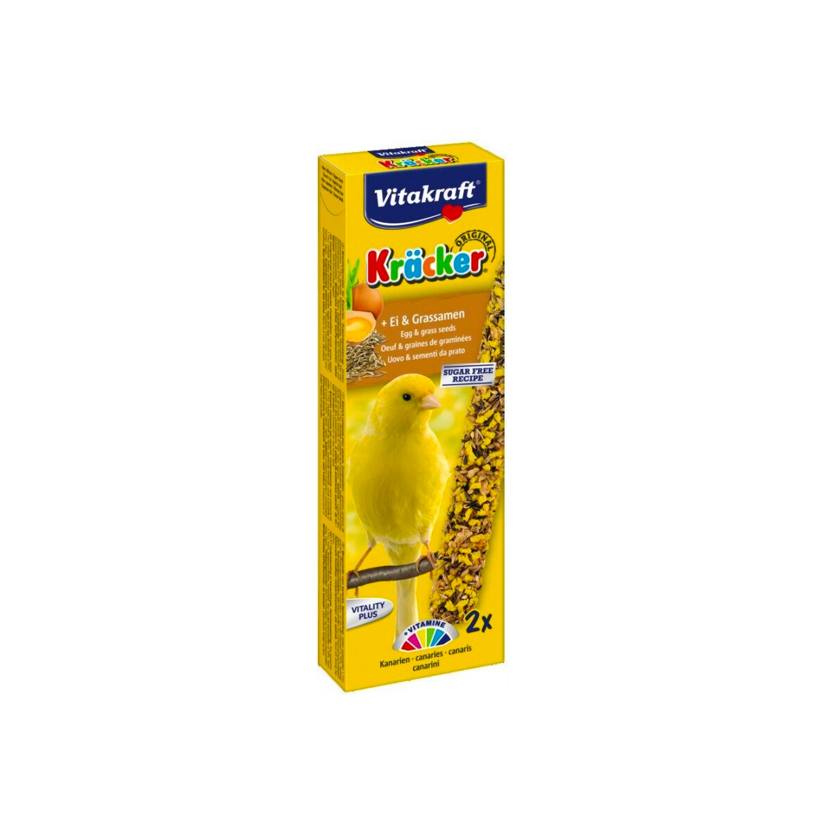 Vitakraft Kräcker Kanarie 2In1 Ei Graszaad. Vitakraft Kräckers zijn gezonde, lekkere en knapperige kräckers speciaal ontwikkeld voor allerlei verschillende soorten vogels. De vogelsnacks zijn 2x gebakken voor een extra krokante smaak. De vogel of vogels moeten hard werken om de zaden van het stokje af te prikken. Hierdoor beweegt de vogel veel in de kooi wat goed is voor de conditie en het uithoudingsvermogen. Deze lekkere kracker ondersteunt de rui en laat de snavel van de vogel op natuurlijke wijze slijten. De kräckers bevatten waardevolle vitamines, zijn bereid volgens een suikervrije receptuur en zijn gemakkelijk in de kooi op te hangen door de cliphouder aan de kräcker.