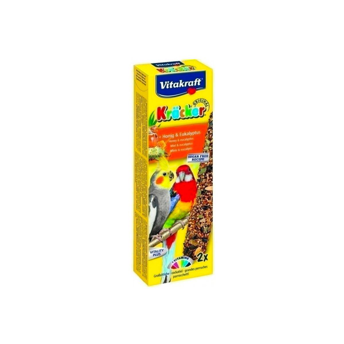 Vitakraft Kräcker Valkparkiet 2In1 Honing Eucalyptus. Vitakraft Kräckers zijn gezonde, lekkere en knapperige kräckers speciaal ontwikkeld voor allerlei verschillende soorten vogels. Deze kräckers zijn 2x gebakken waardoor het een extra natuurlijk effect geeft. De vogel of vogels moeten hard werken om de zaden van het stokje af te prikken. Hierdoor verveelt je vogel zich niet en beweegt de vogel veel in de kooi. Dit is goed voor de conditie en het uithoudingsvermogen. Deze lekkere kräcker ondersteunt de rui en laat de snavel van de vogel op natuurlijke wijze slijten.