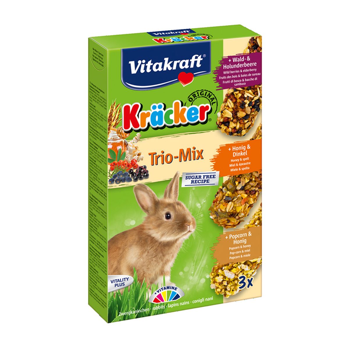 Vitakraft Kräcker Trio-Mix Konijn 3-in-1 is verkrijgbaar in verschillende varianten: Bosbessen-Honing-Popcorn, Groente-Noot-Bosbessen & Popcorn-Groente-Noot.