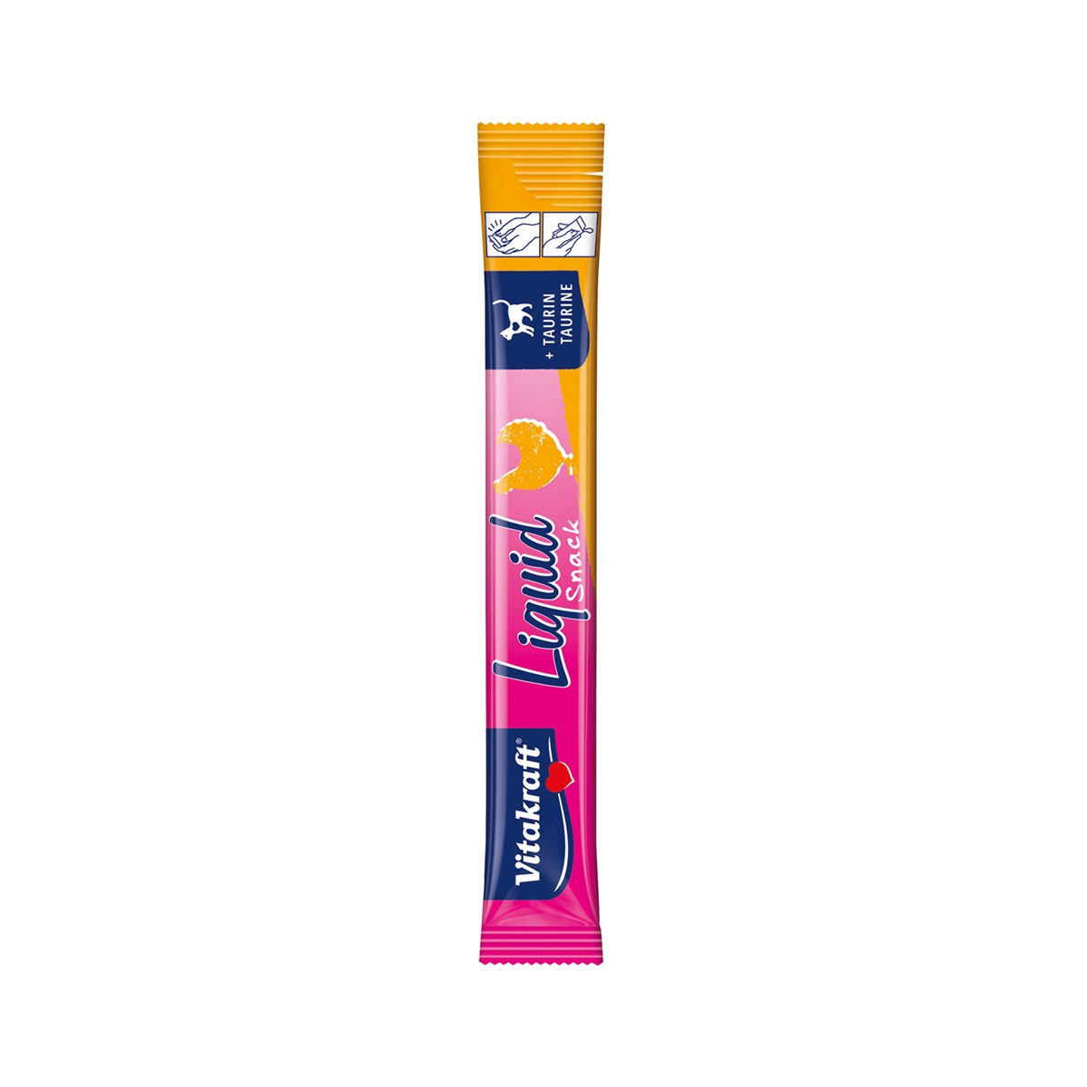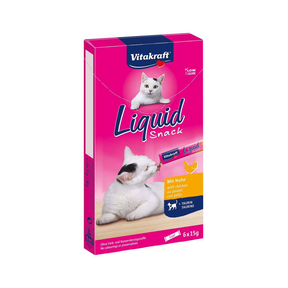 Vitakraft Liquid Snack Kip&Taurine 6stuks. Vloeibare snack met kip en taurine voor de ondersteuning van de ogen en het hart van de kat. De snack kan puur, als toplaag over de hoofdvoeding om de acceptatie te verhogen of ingevroren als ijsje gevoerd worden. Het bevat weinig caloriën, heeft een suikervrije receptuur en is voor katten vanaf 3 maanden geschikt. De snack is per 6 stuks verpakt.