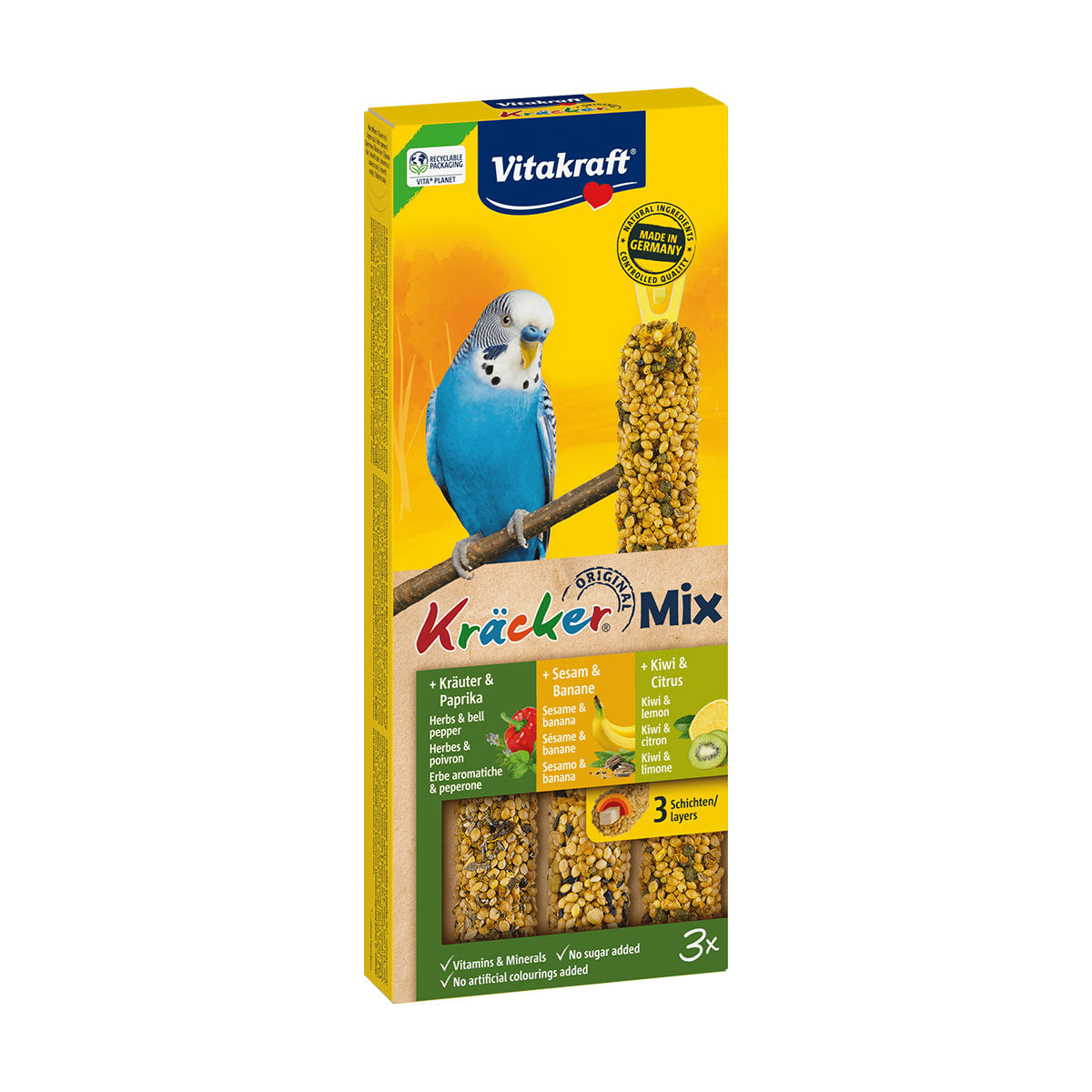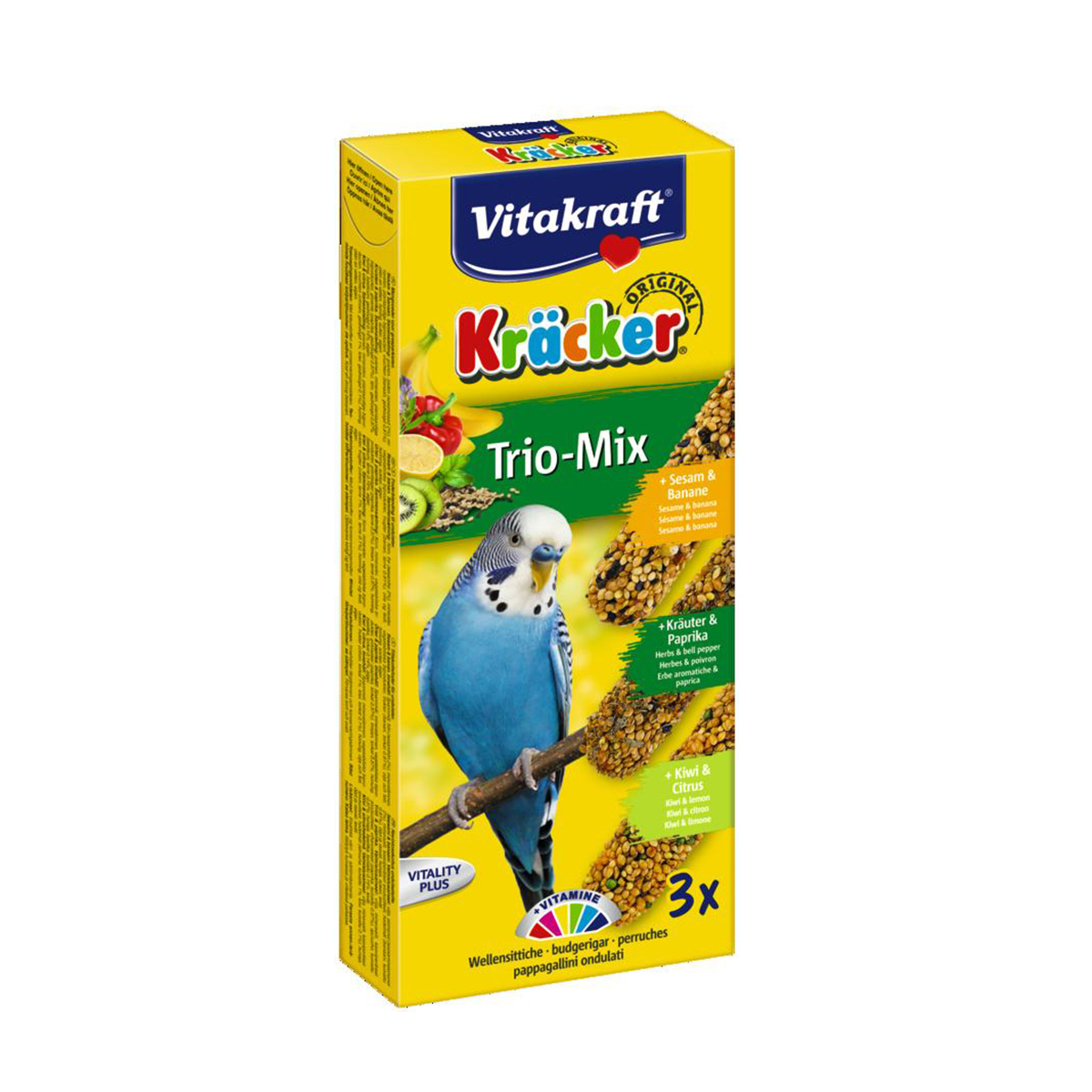 Vitakraft Trio Mix Kräcker Parkiet 3in1 Banaan-Kruiden-Kiwi. Heerlijke kräcker voor je vogel. Doordat de Kräcker meerdere keren afgebakken is, zitten de zaden stevig op het houten stokje en moet je parkiet moeite doen om de zaden los te krijgen, dit houdt je parkiet actief. Daarnaast slijten parkieten de snavel op een natuurlijke wijze door het intensieve gebruik om de zaden los te krijgen. De Kräcker bevat belangrijke mineralen en is hierom een prima aanvulling op het dagenlijkse rantsoen. De speciaal geselecteerde smaken zijn speciaal afgestemd op de parkiet en zullen gegarandeerd gewaardeerd worden door je parkiet.