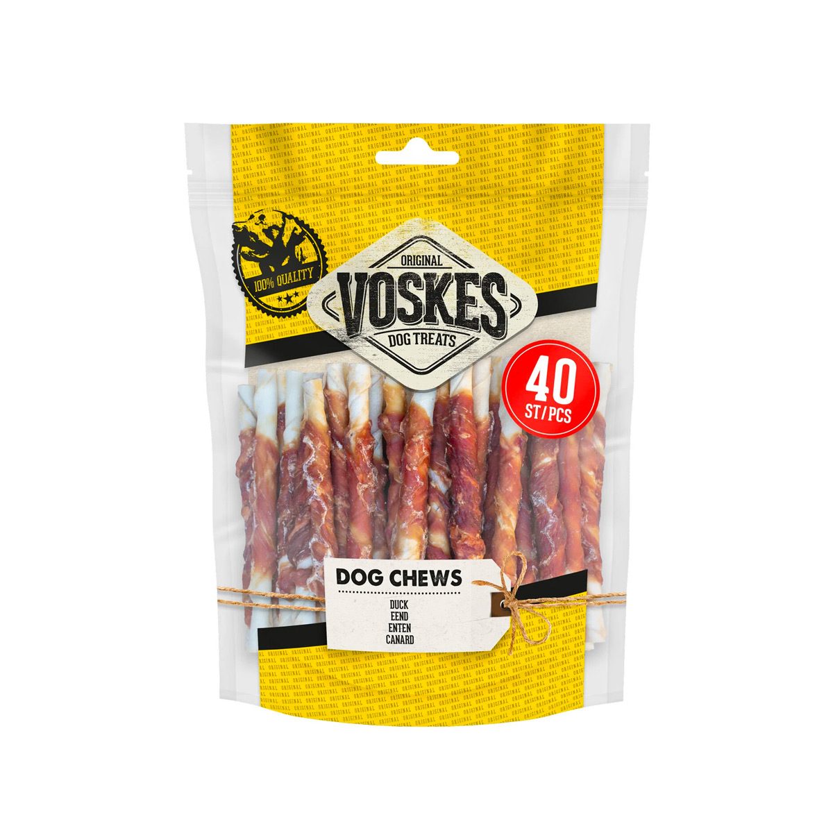 De Voskes Eend Twist Kauwsticks zijn heerlijke hondensnacks bestaande uit runderhuid en eend. De voordeelverpakking bevat 40 smaakvolle sticks die het kauwgedrag van jouw hond stimuleren.