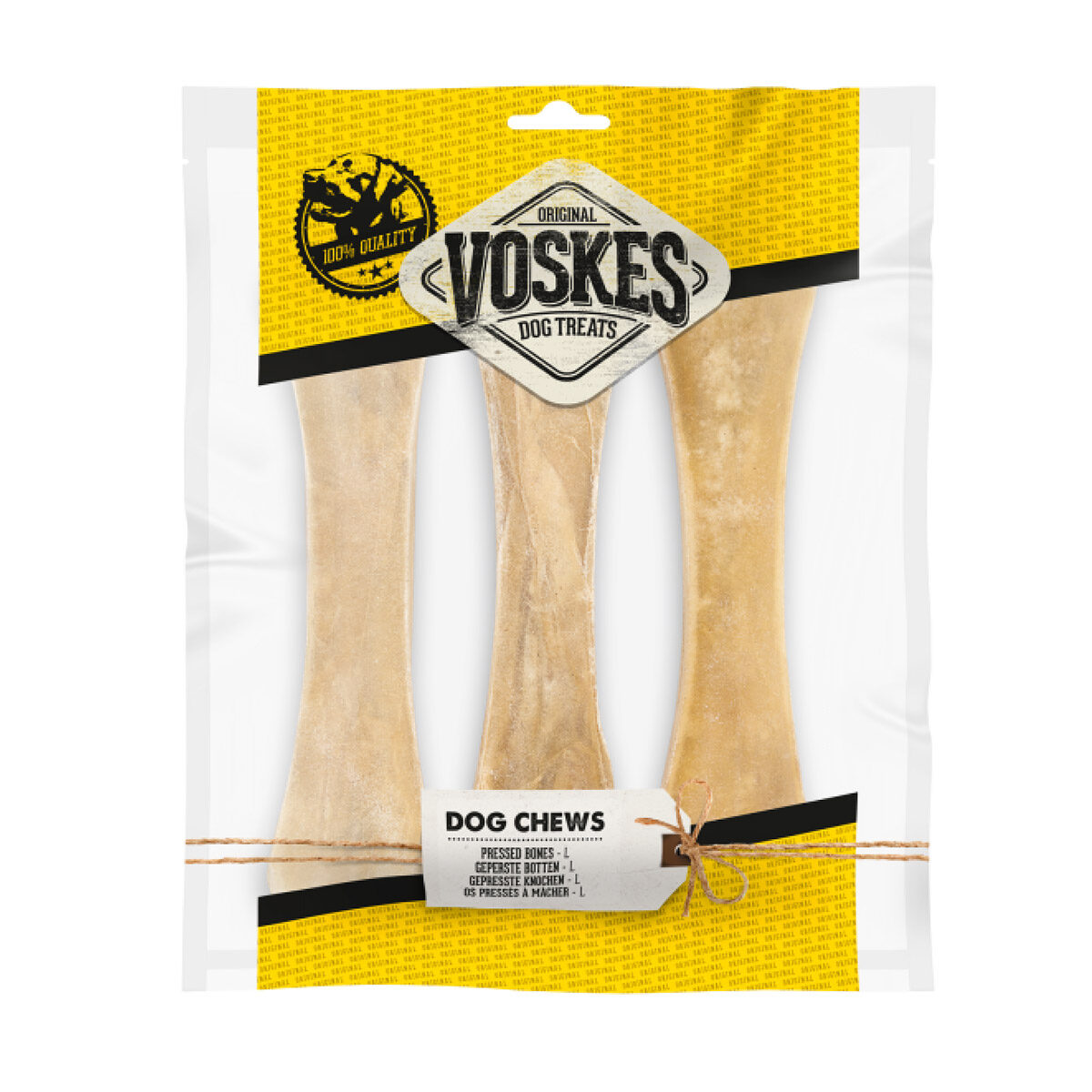 Voskes Geperste Botten L 3st gemaakt van gedroogde runderhuid. Dit geperste bot van Voskes is een smakelijke snack voor veel kauwplezier. Honden vinden het heerlijk om op de gedroogde huid te kauwen en het draagt ook bij aan het schoonhouden van het gebit.