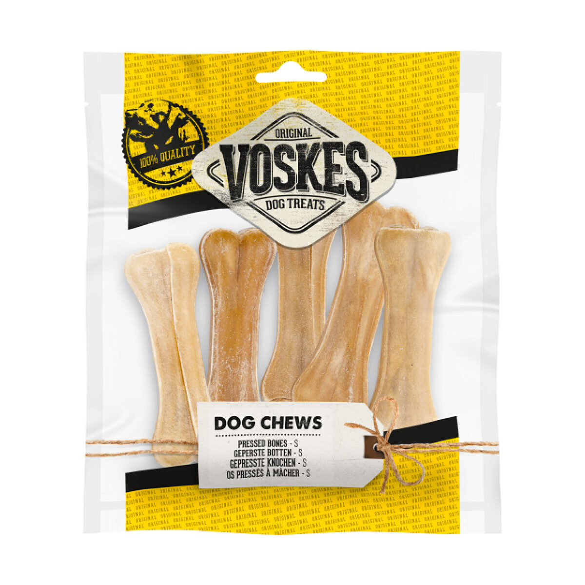 Voskes Geperste Botten S 5st gemaakt van gedroogde runderhuid. Dit geperste bot van Voskes is een smakelijke snack voor veel kauwplezier. Honden vinden het heerlijk om op de gedroogde huid te kauwen en het draagt ook bij aan het schoonhouden van het gebit.