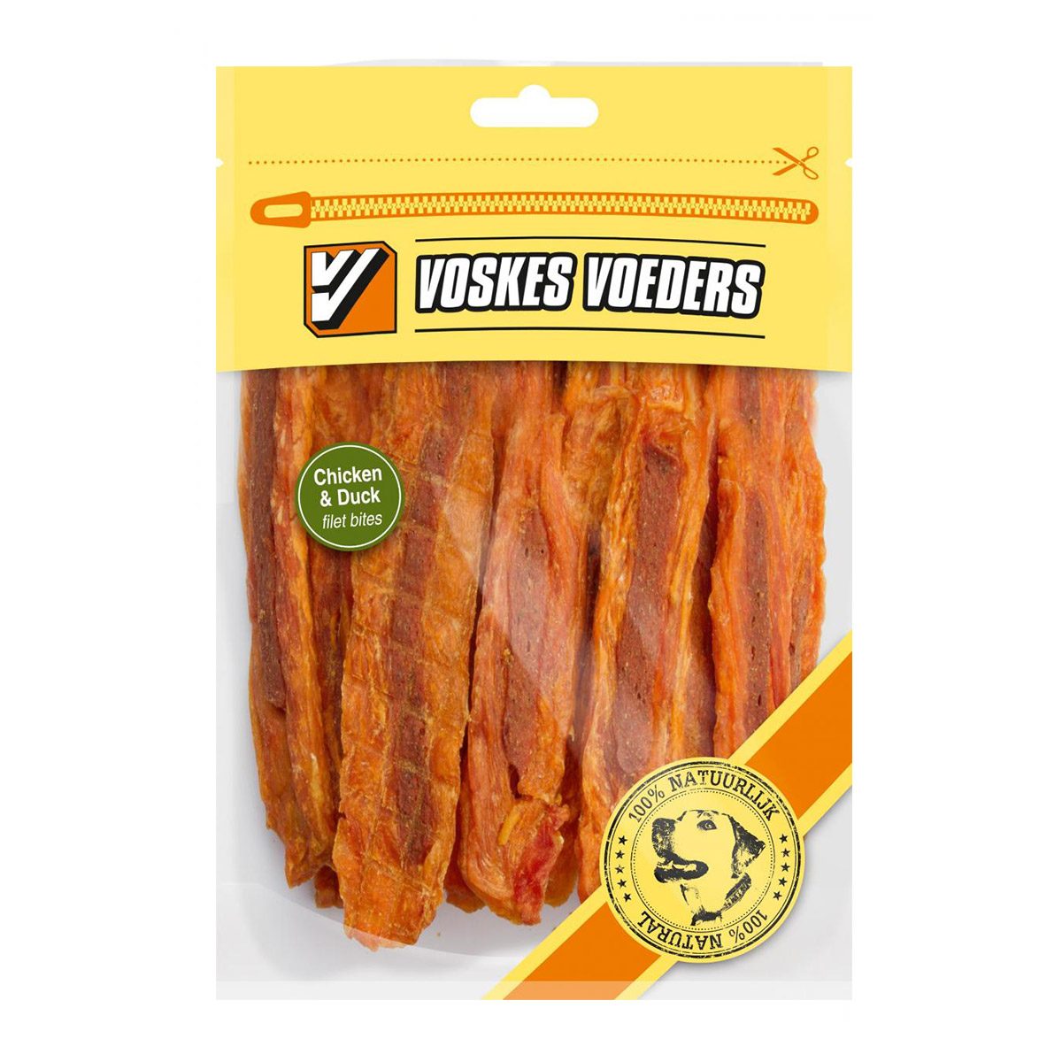 Voskes Kipfilets Eend is een smaakvolle snack van malse, gedroogde kipfilet. In combinatie met Eend is dit een heerlijke snack voor je hond. De strips zijn ideaal om aan je hond te geven als tussendoortje.
