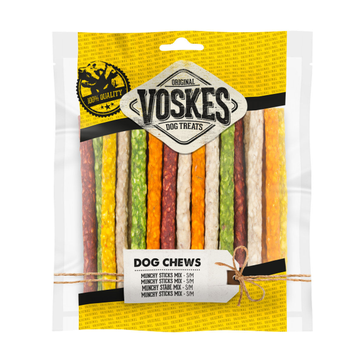 Voskes Munchy Sticks Mix zijn gemaakt van geperste, ongelooide runderhuid. Deze Munchy Sticks zijn zachte kauwsnacks gemaakt van natuurlijke ingrediënten. Deze sticks van Voskes zijn ook geschikt voor oudere honden die moeilijker kunnen kauwen op harde botten. Voskes Munchy Sticks bevat vijf verschillende kleuren ens maken. Ideaal voor de hond die van een beetje variatie houdt!