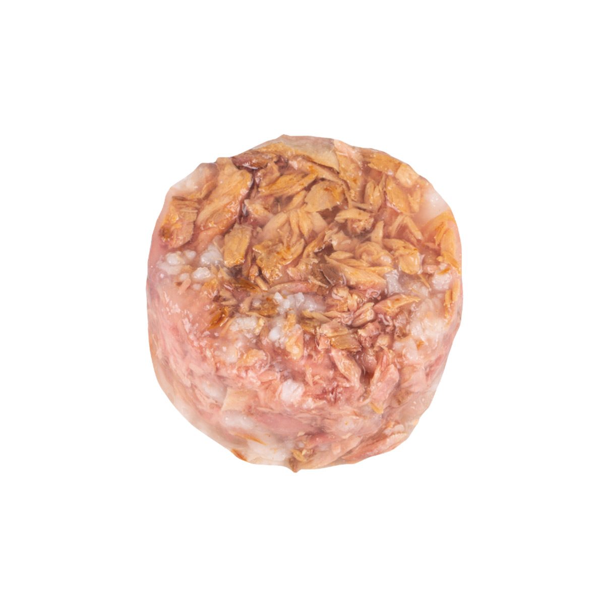 Samenstelling: TONIJN 51%, ZALM 6%, RIJST 1,5%, PLANTAARDIGE GELATINE 0,75%.