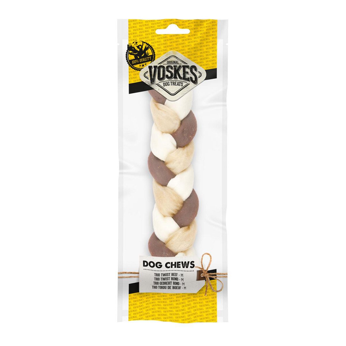 De Voskes Twist Trio Rund is een vlecht gemaakt van witte koeienhuid, een smakelijke strip van rund en rawhide. Dit is een zeer taaie maar ook heerlijke snack. De vorm van de snack zorgt ervoor dat je hond zijn gebit reinigt wanneer hij hierop kauwt.